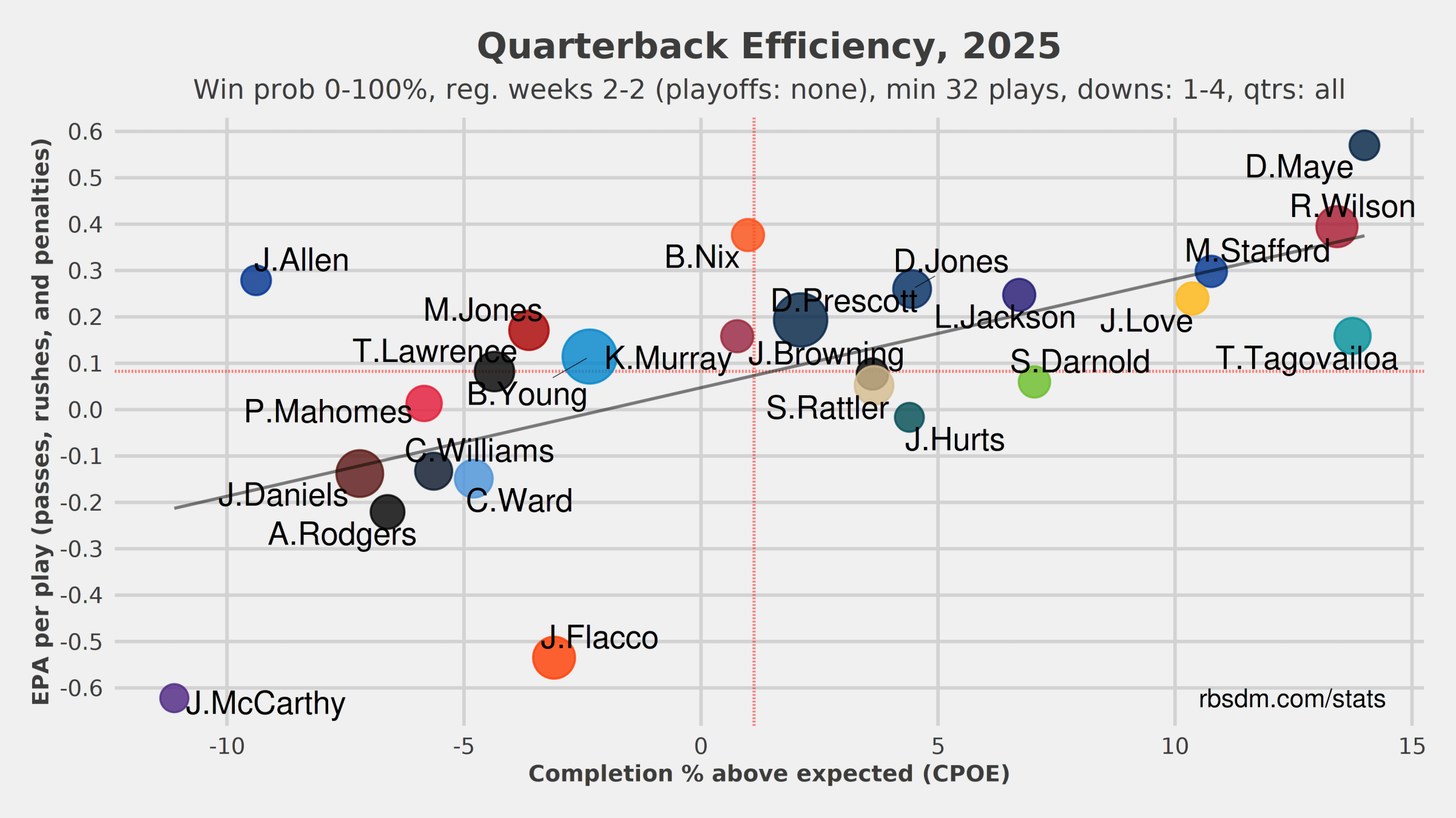 Russell Wilson had what must be one of the most amazing games of his career yesterday, with 450 passing yards and 3 TDs. Unfortunately his one awful pass in overtime led to the winning field goal, but that shouldn’t take much away from the rest of his performance. In advanced stats, he was just behind Drake Maye (19 of 23 for 230 yards and 2 TDs) for the league high in expected points added per play and third in completion percentage over expected: