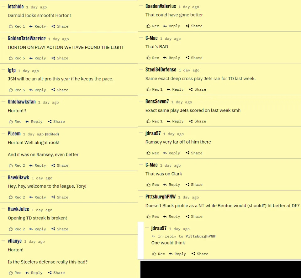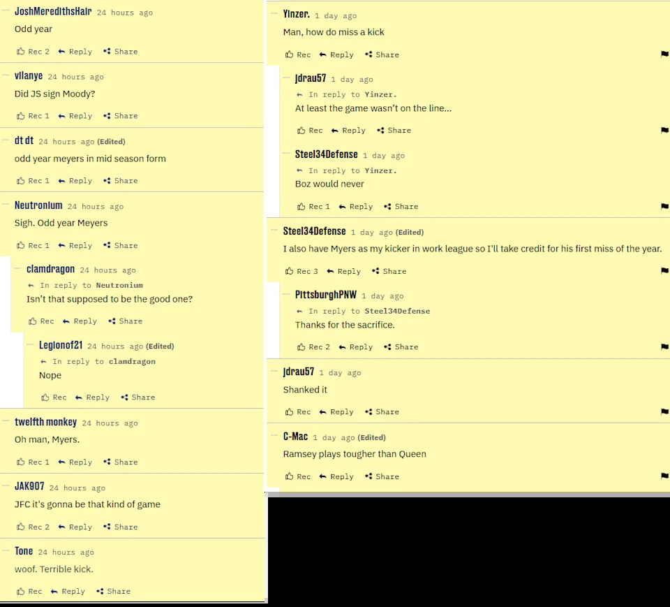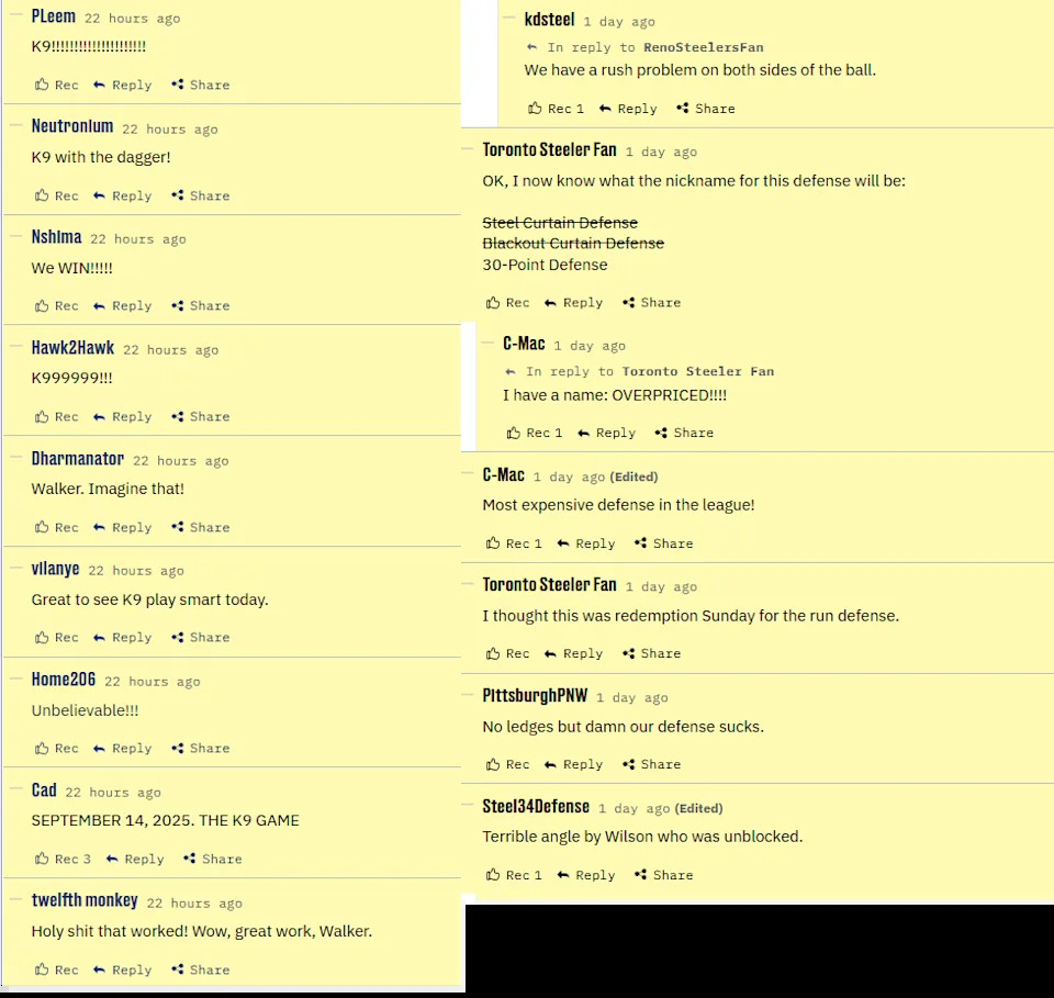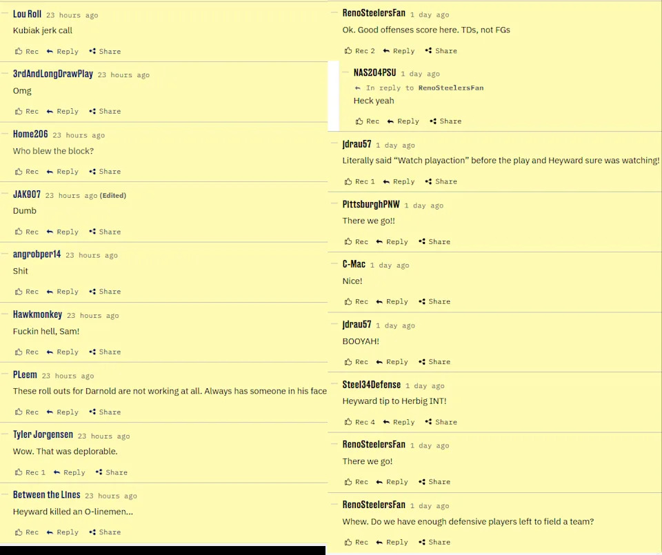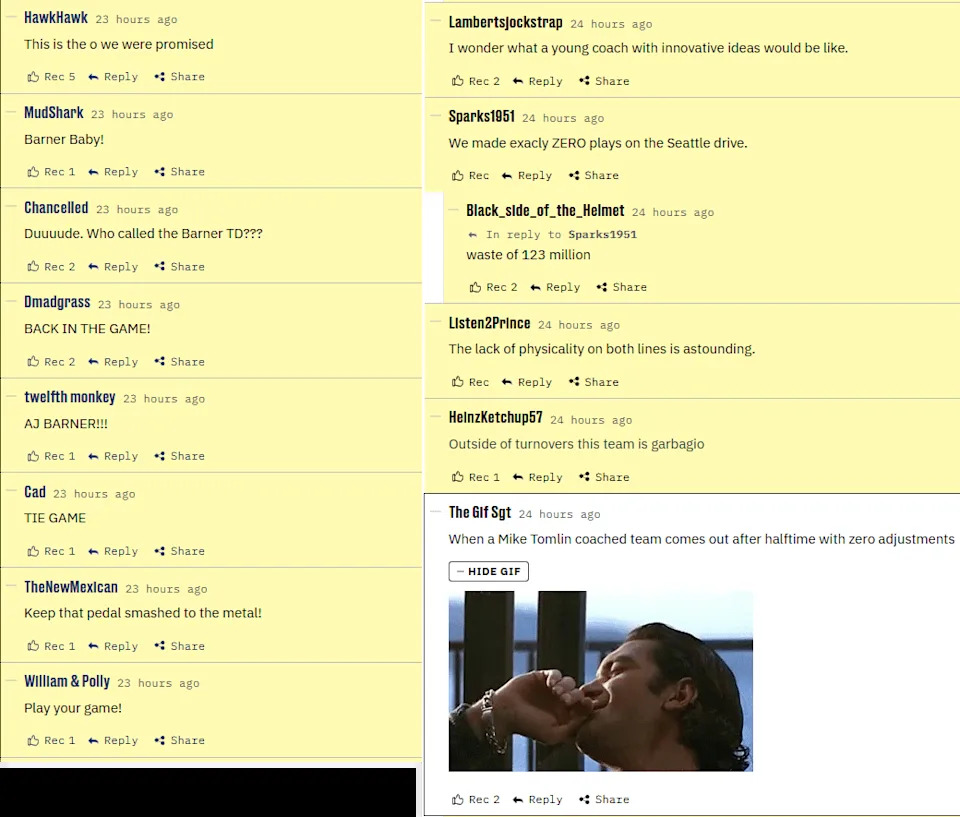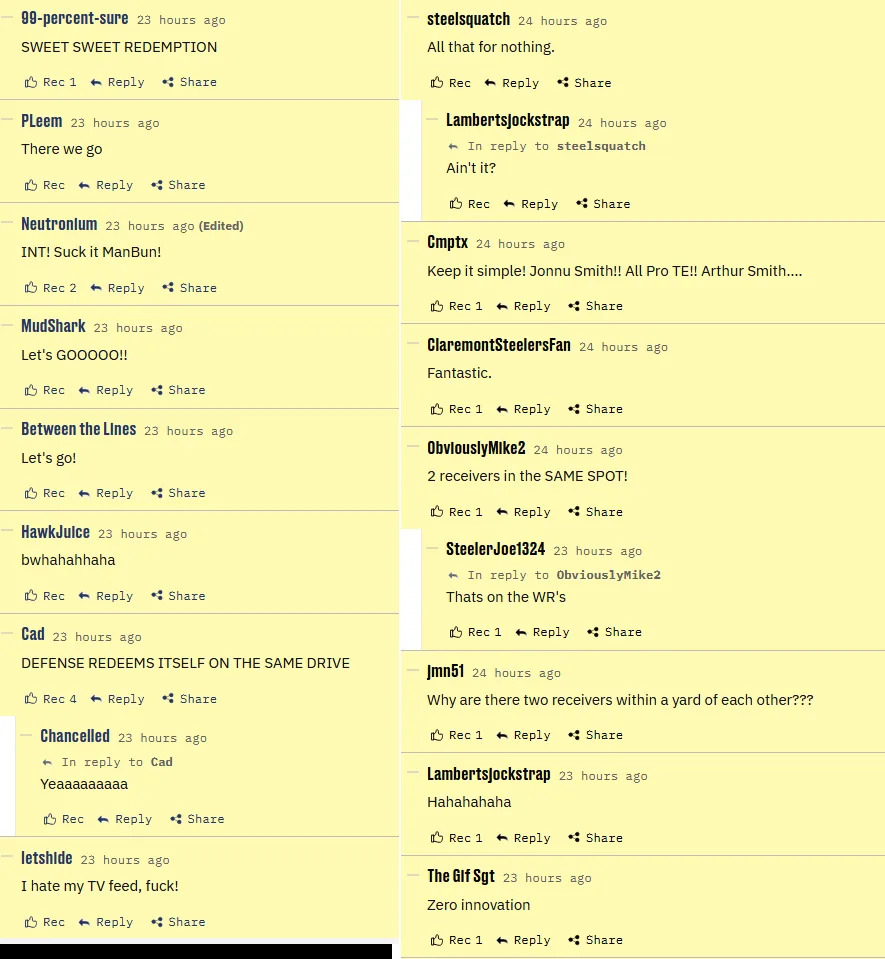 It’s time for Enemy Reaction! Steelers fans are loud, proud, and always down for a meltdown when things don’t go their way. Game thread comments are courtesy of Behind the Steel Curtain. If you’re new to this series, I try to have as many relevant highlights as possible but sometimes it doesn’t quite work out based on comment participation, and that’s the case for the latter stages of the game when it was clear Pittsburgh wouldn’t win.