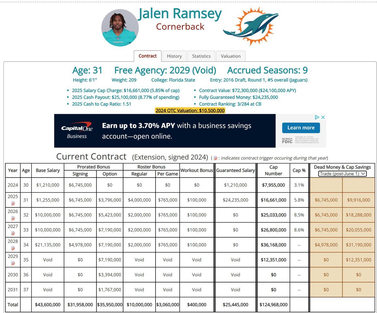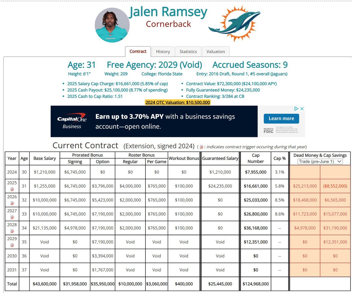 Jason Fitzgerald with Over the Cap reported that the Dolphins would have two opportunities to trading Ramsey. The first would be during draft weekend and the second before August 30th. With the draft over, the Dolphins will work to offload Ramsey before owing him a $18.98 million bonus. June 1st is a key date because of the Dolphins ability to move Ramsey via a post-June 1 trade. A pre-June 1 trade hampers the Dolphins with a $25.2 million dead cap charge.