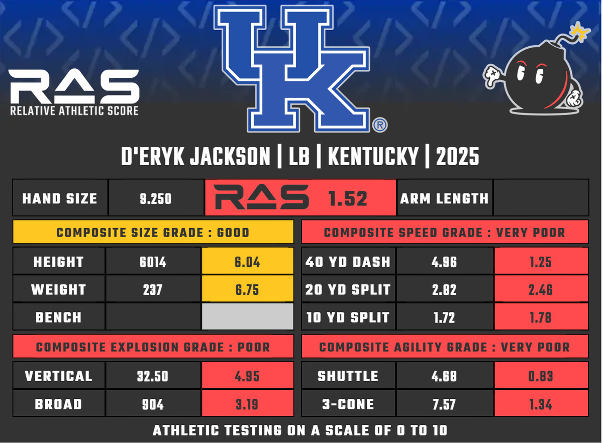 To demonstrate the importance of needing to wait for official times from college pro days, here is what Jackson’s RAS looked like in the immediate aftermath of his pro day in March with unofficial 40 times and splits.