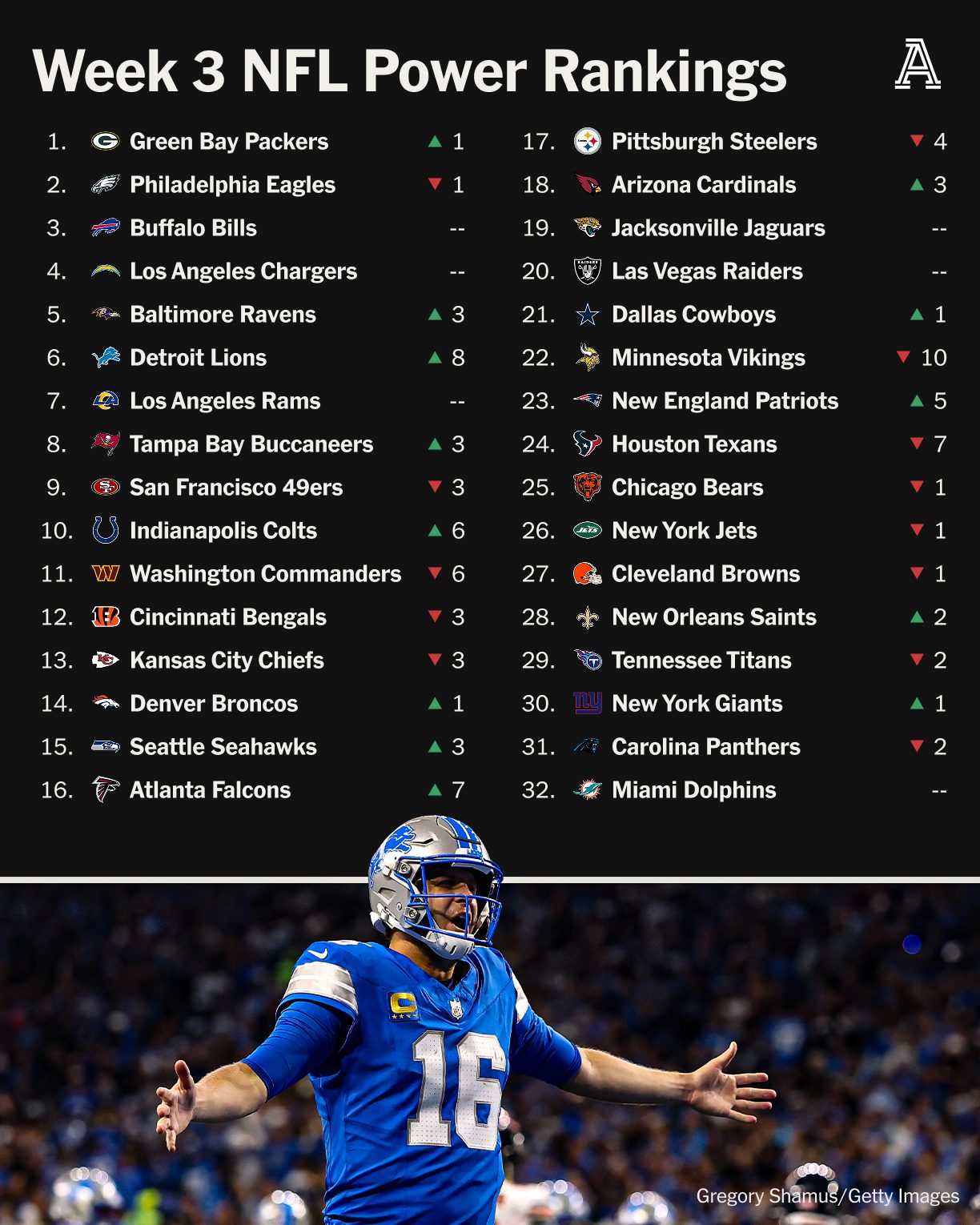 The ripple effects of injuries to Joe Burrow (turf toe), Brock Purdy (turf toe), Jayden Daniels (knee), Justin Fields (concussion) and J.J. McCarthy (ankle) are still shaking out, though they appear to have influenced The Athletic’s Week 3 Power Rankings.
