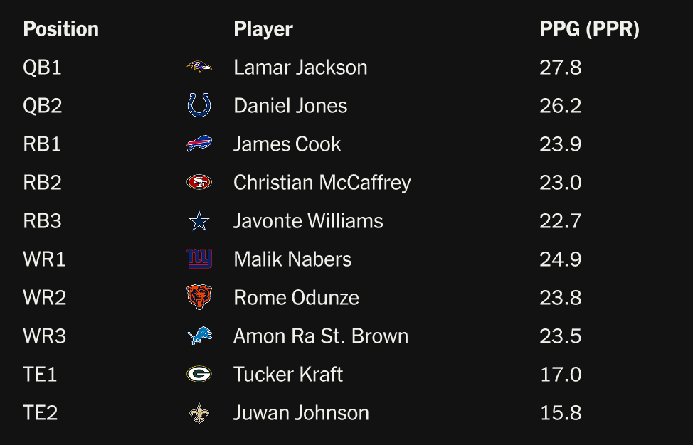 Jacob: After Week 2 last season, Rhamondre Stevenson’s 19.3 PPG average had him looking like a league-winner. He averaged 4.3 points across Weeks 3 and 4. Could Cowboys RB Javonte Williams’ hot start — 22.7 PPG — fade as quickly, or might Williams continue to be a true league-winner? I can’t tell.