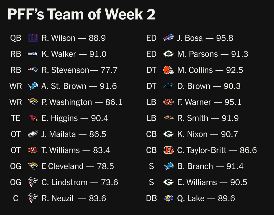 🦁 Bounce-back Lions. In the chart above, you’ll notice two of Detroit’s stars among the league’s best Week 2 performers. Receiver Amon-Ra St. Brown (115 yards, three touchdowns) and safety Brian Branch (team-high six tackles, one sack) are featured often in Colton Pouncy’s film review on what the Lions fixed.