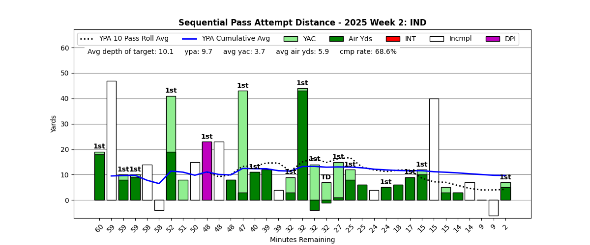 He’s completing passes and piling up first downs. The solid blue line shows how his yardage efficiency tailed off toward the end of the game—which isn’t great—but quarters 1–3 were outstanding. A 68.6% completion rate with 9.7 yards per attempt? Gotta love it.