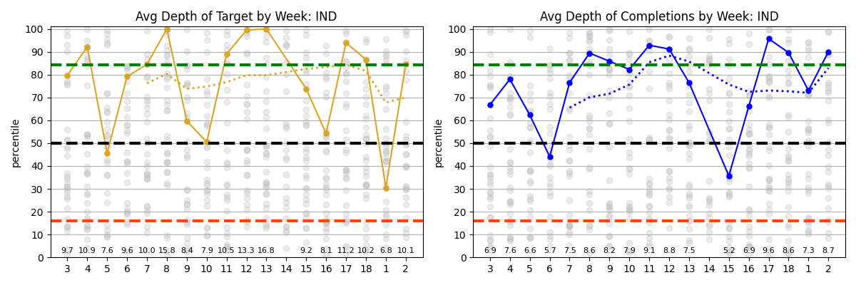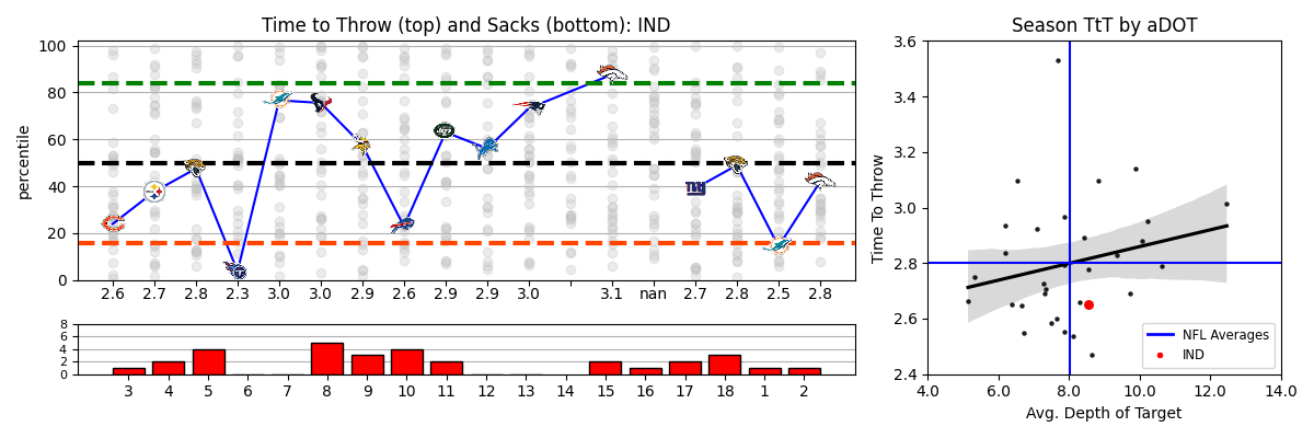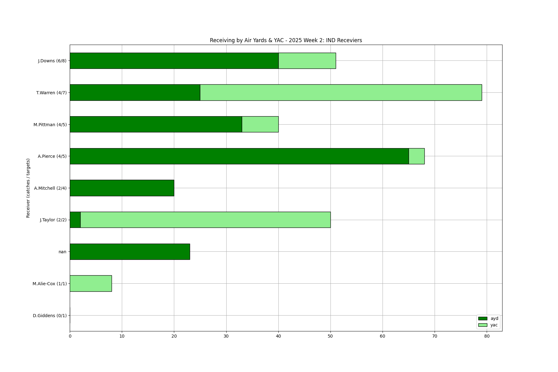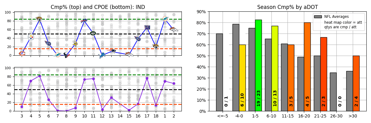 The Colts’ run game took a step back this week—which actually worked in their favor, as they leaned on the pass (15th ARSR, 7th EDP).Jones faced much more pressure, but he responded by getting rid of the ball faster, scrambling more often, and throwing it away when necessary—all while still avoiding sacks (3rd PR%, 18th TIP, 10th SCR%, 17th TA%, 29th SCK%).He threw long and completed long (6th aDOT, 3rd AY/C).Just like last week, his accuracy stood out, boosting yards after catch and driving impressive yardage efficiency (9th CPOE, 10th YACOE, 7th AYP/A).His ability to avoid sacks without completely abandoning passing plays (22nd AA%, 29th SCK%) pushed his efficiency to 8.6 yards per dropback (4th NY/D). Designed runs brought that down slightly to 7.9 yards per play overall (8th NY/P).With that kind of yardage efficiency, moving the chains was easy—but it didn’t translate into passing touchdowns (2nd in first down rate, 19th in TD rate).Most importantly, he kept the “no turnovers” streak alive, which helped his EPA remain high (25th TO%, 8th EPA/d).
