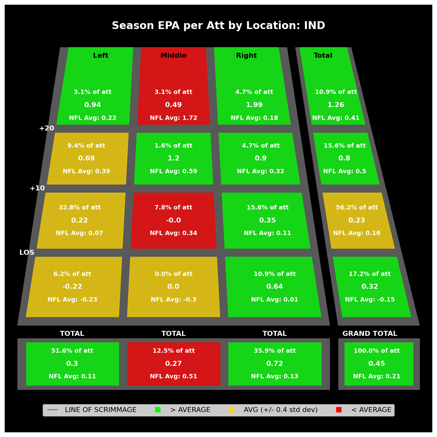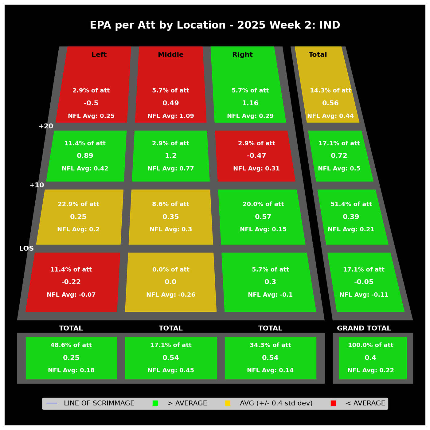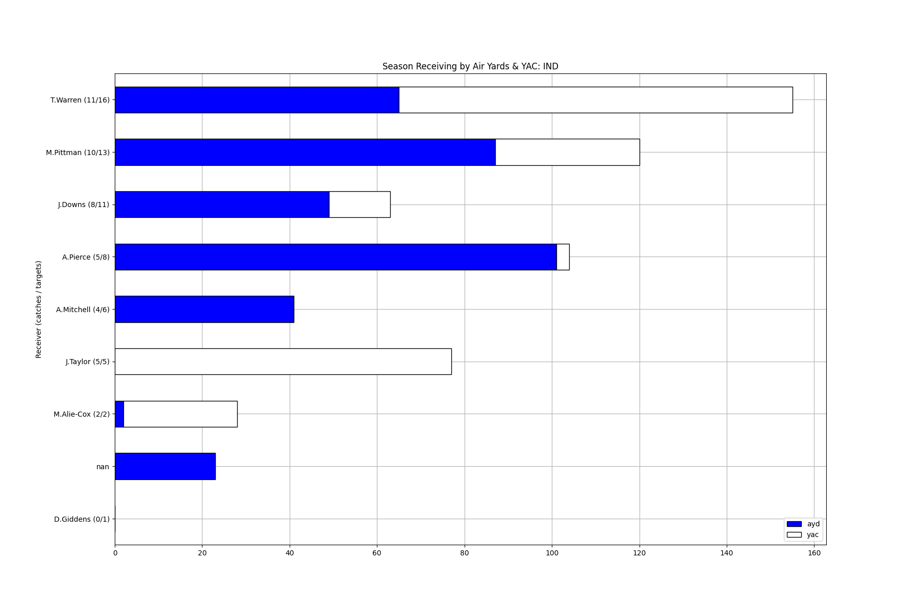 The Colts’ run game took a step back this week—which actually worked in their favor, as they leaned on the pass (15th ARSR, 7th EDP).Jones faced much more pressure, but he responded by getting rid of the ball faster, scrambling more often, and throwing it away when necessary—all while still avoiding sacks (3rd PR%, 18th TIP, 10th SCR%, 17th TA%, 29th SCK%).He threw long and completed long (6th aDOT, 3rd AY/C).Just like last week, his accuracy stood out, boosting yards after catch and driving impressive yardage efficiency (9th CPOE, 10th YACOE, 7th AYP/A).His ability to avoid sacks without completely abandoning passing plays (22nd AA%, 29th SCK%) pushed his efficiency to 8.6 yards per dropback (4th NY/D). Designed runs brought that down slightly to 7.9 yards per play overall (8th NY/P).With that kind of yardage efficiency, moving the chains was easy—but it didn’t translate into passing touchdowns (2nd in first down rate, 19th in TD rate).Most importantly, he kept the “no turnovers” streak alive, which helped his EPA remain high (25th TO%, 8th EPA/d).