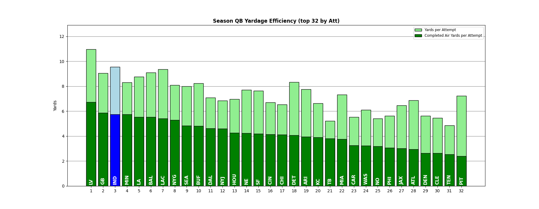 Passing depth was up this week (6th-longest average attempt), and the high completion rate translated into long gains as well (7th-longest yards per completion).