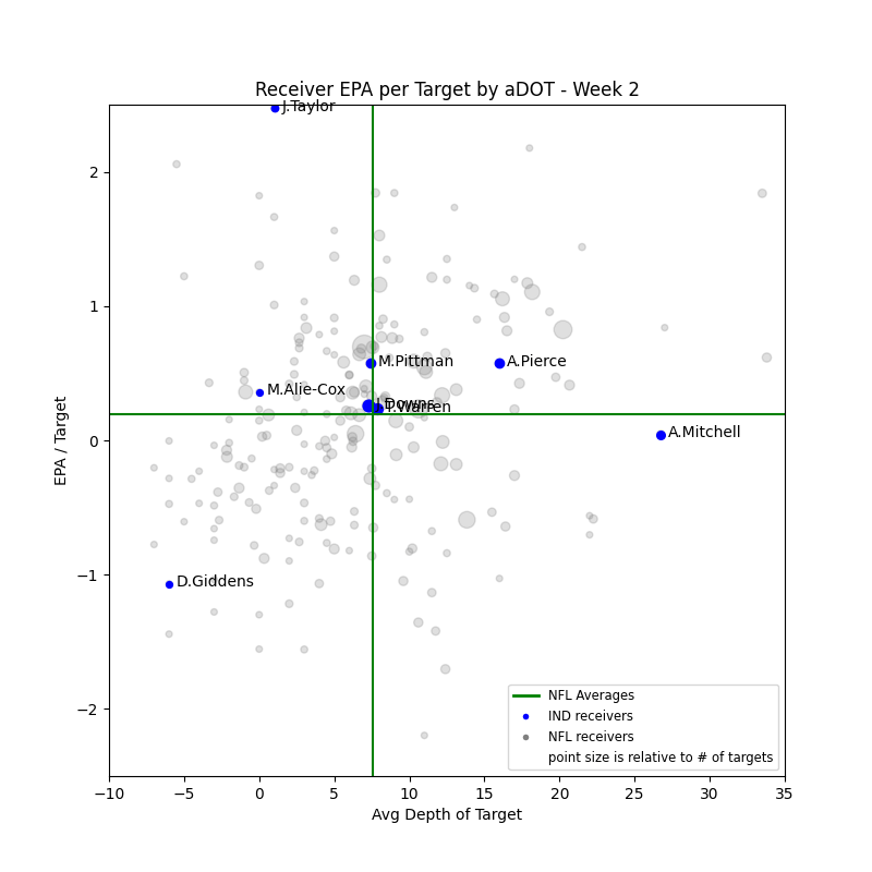 This is a good spread: most receivers are producing higher-than-average EPA per target, with Taylor almost off the chart… almost.