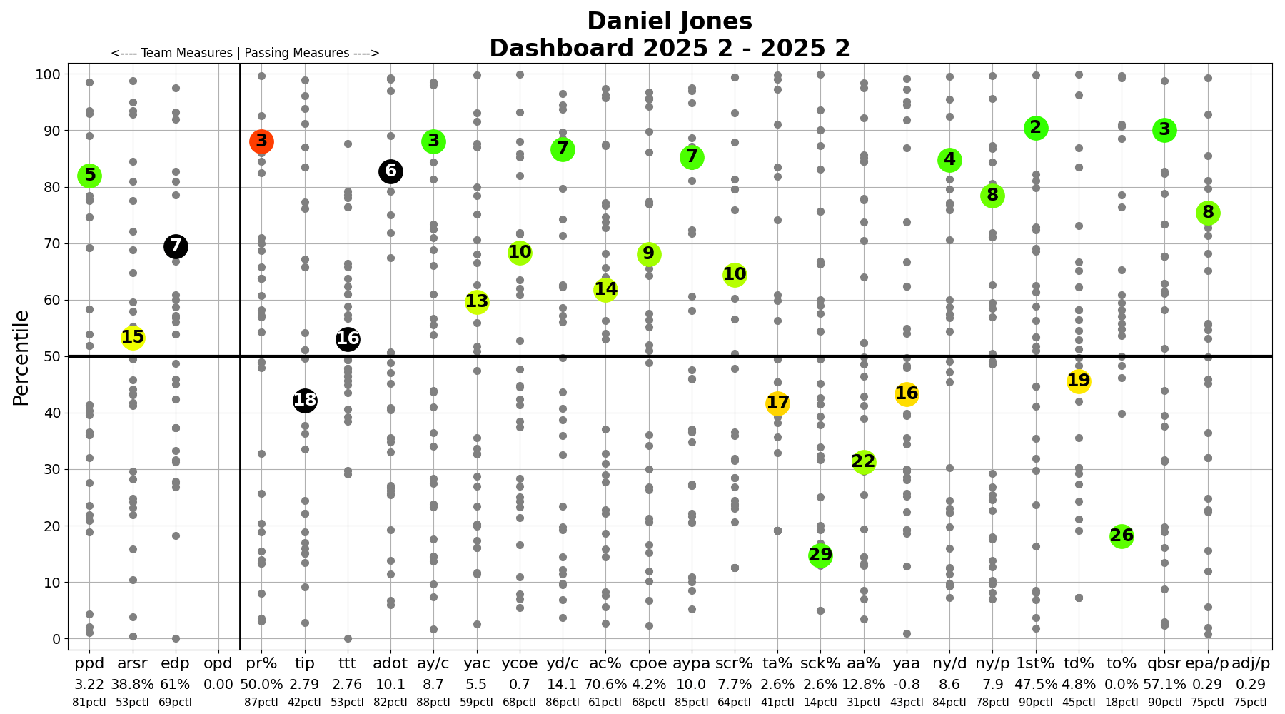 The Colts’ run game took a step back this week—which actually worked in their favor, as they leaned on the pass (15th ARSR, 7th EDP).Jones faced much more pressure, but he responded by getting rid of the ball faster, scrambling more often, and throwing it away when necessary—all while still avoiding sacks (3rd PR%, 18th TIP, 10th SCR%, 17th TA%, 29th SCK%).He threw long and completed long (6th aDOT, 3rd AY/C).Just like last week, his accuracy stood out, boosting yards after catch and driving impressive yardage efficiency (9th CPOE, 10th YACOE, 7th AYP/A).His ability to avoid sacks without completely abandoning passing plays (22nd AA%, 29th SCK%) pushed his efficiency to 8.6 yards per dropback (4th NY/D). Designed runs brought that down slightly to 7.9 yards per play overall (8th NY/P).With that kind of yardage efficiency, moving the chains was easy—but it didn’t translate into passing touchdowns (2nd in first down rate, 19th in TD rate).Most importantly, he kept the “no turnovers” streak alive, which helped his EPA remain high (25th TO%, 8th EPA/d).