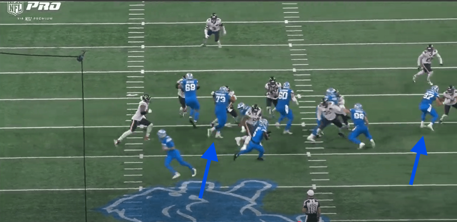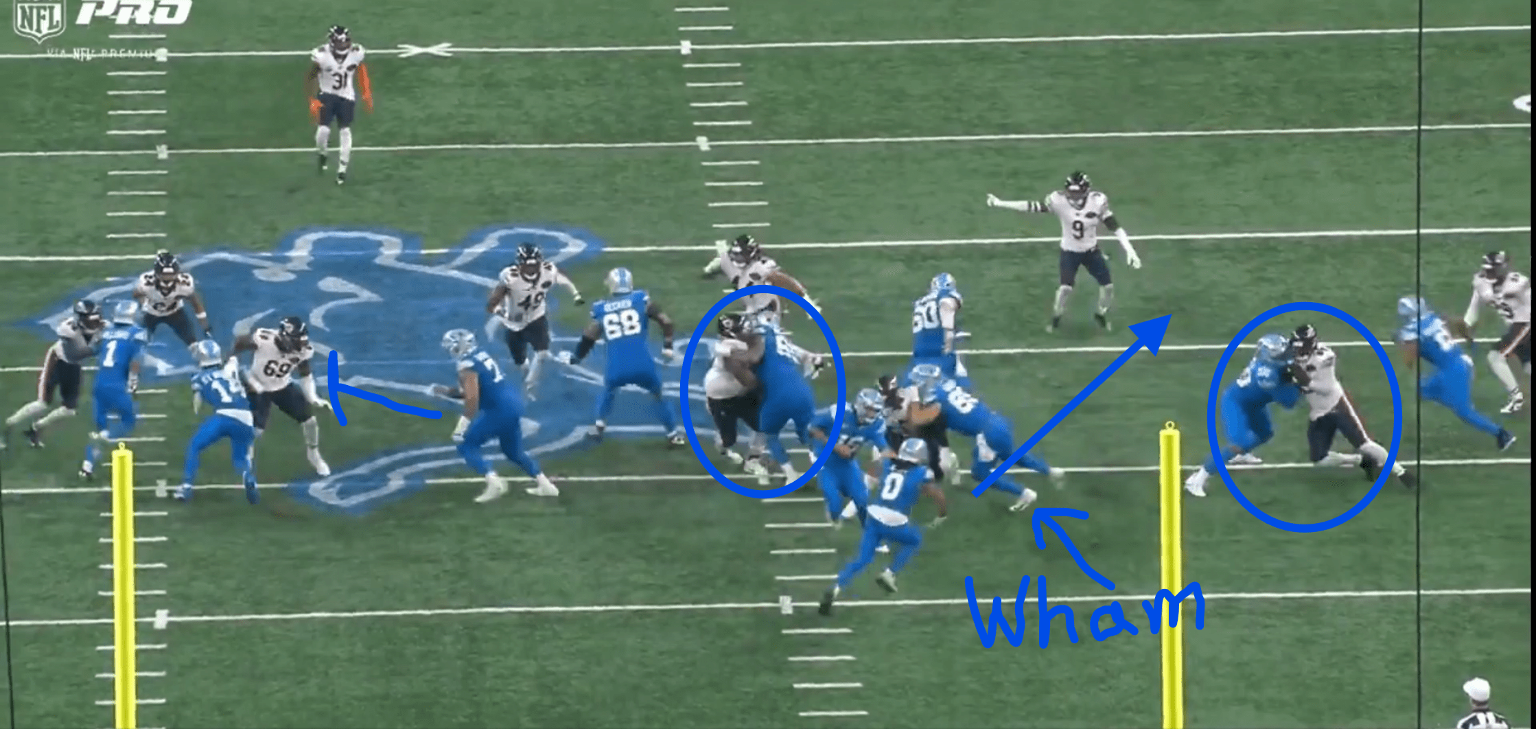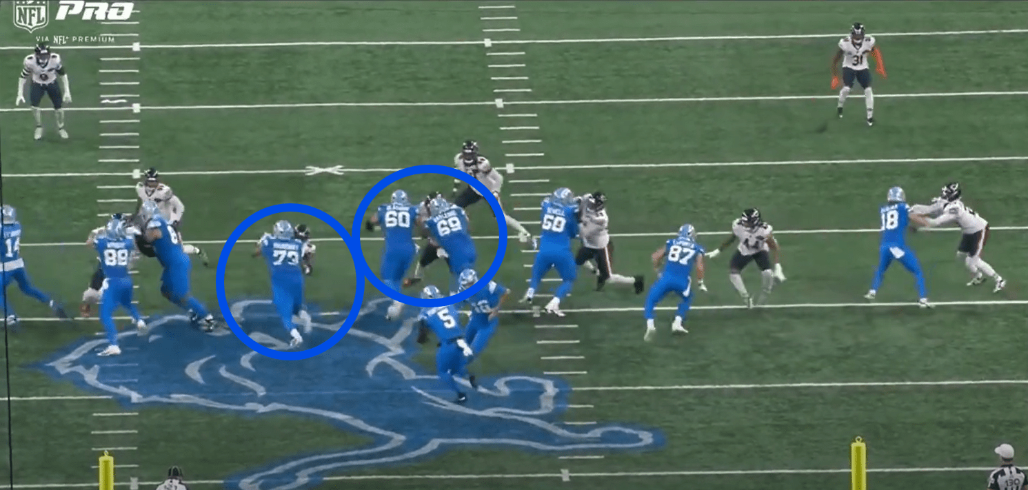 Now working with a fresh set of downs, Goff is back under center with tight ends Sam LaPorta and Brock Wright in-line with Sewell, and Montgomery in the backfield. Once the ball is snapped, keep your eyes on both guards. On the left side, we have an excellent reach block from Mahogany against the Bears’ defensive tackle. With the defender lined up on the left shoulder of Glasgow, Mahogany fires out of his stance and is able to drive his assignment off the line of scrimmage.