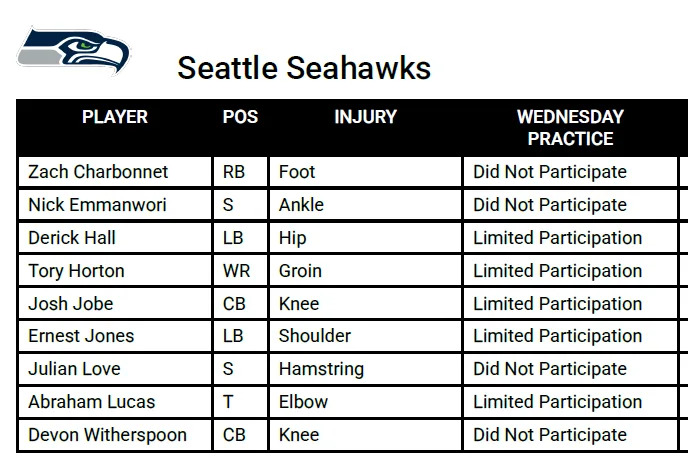 Here’s the full injury report for the Seahawks, with their next practice scheduled for Thursday. You might sound the alarm bells if some of these DNPs from Wednesday are also DNPs on Thursday. It’s also worth noting this was a fully padded practice, of which there are limited opportunities for NFL teams to conduct those during the regular season.
