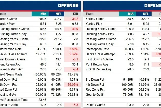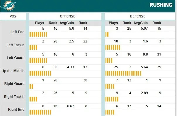 One unexpected bright spot for Miami is their yards per play. It’s incredible to see that stat next to their yards per game number, which is quite a bit below average.