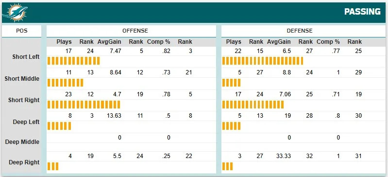It’s a similar situation on offense for the passing game, with several zones looking good. The short left zone would be considered elite in completion percentage by my rule of four, and the average gain would be in the very good range. Against an injury-plagued defense, quarterback Tua Tagovailoa’s quick-strike style might have some opportunities.