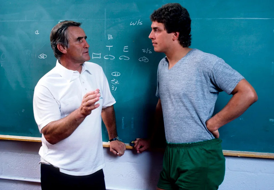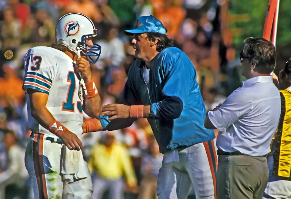 Miami Dolphins head coach Don Shula talks with quarterback Dan Marino during July training camp before the 1984 NFL season. Marino would go on to win the 1984 NFL MVP award.