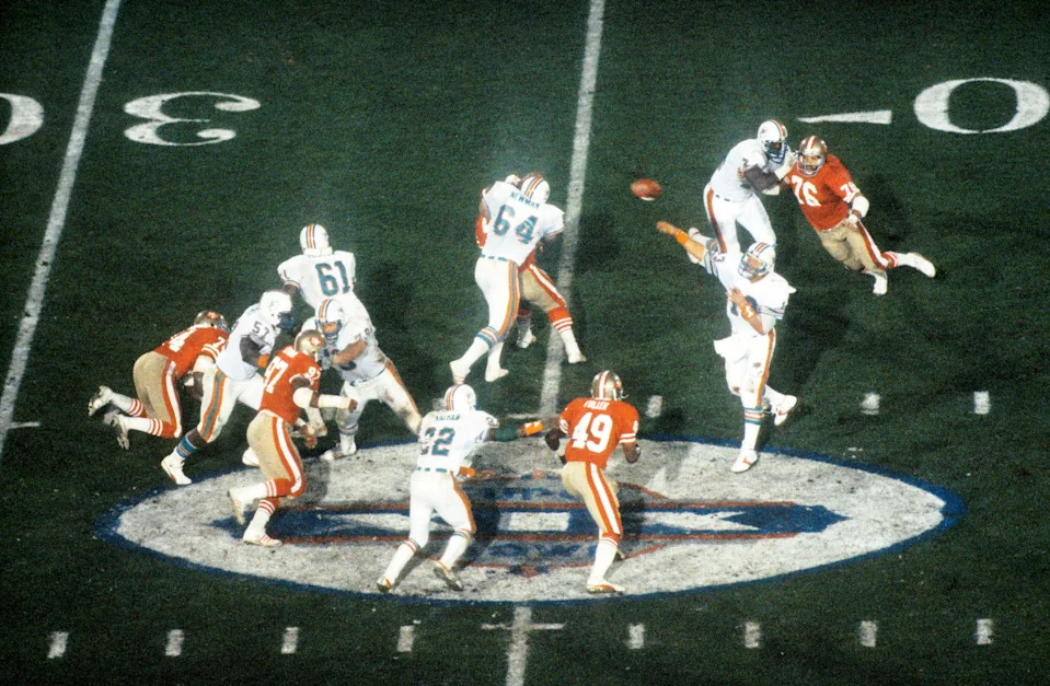 Miami Dolphins quarterback Dan Marino throws the ball against the San Francisco 49ers during Super Bowl XIX at Stanford Stadium on Jan. 20, 1985. The 49ers defeated the Dolphins, 38-16.