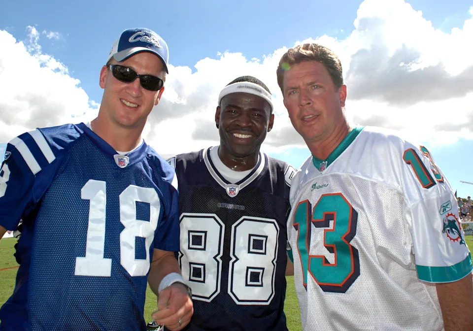Indianapolis Colts quarterback Peyton Manning, former Dallas Cowboys wide receiver Michael Irvin and former Miami Dolphins quarterback Dan Marino pose for a photo during a flag football legends game during 2005 Pro Bowl week in Honolulu on Feb. 11, 2005.