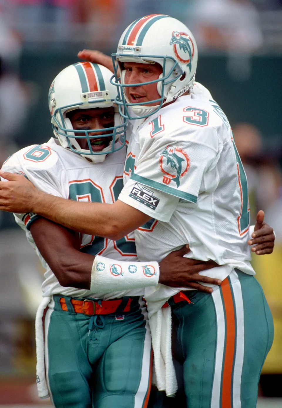 Miami Dolphins quarterback Dan Marino and receiver Fred Banks celebrate a touchdown against the Houston Oilers at Joe Robbie Stadium on Nov. 22, 1992.