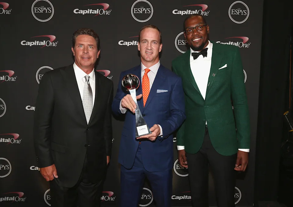 Former NFL quarterback Dan Marino, NFL quarterback Peyton Manning and NBA player Kevin Durant pose for the award for Best Record Breaker at the 2014 ESPY Awards at Nokia Theatre L.A. Live on July 16, 2014, in Los Angeles.