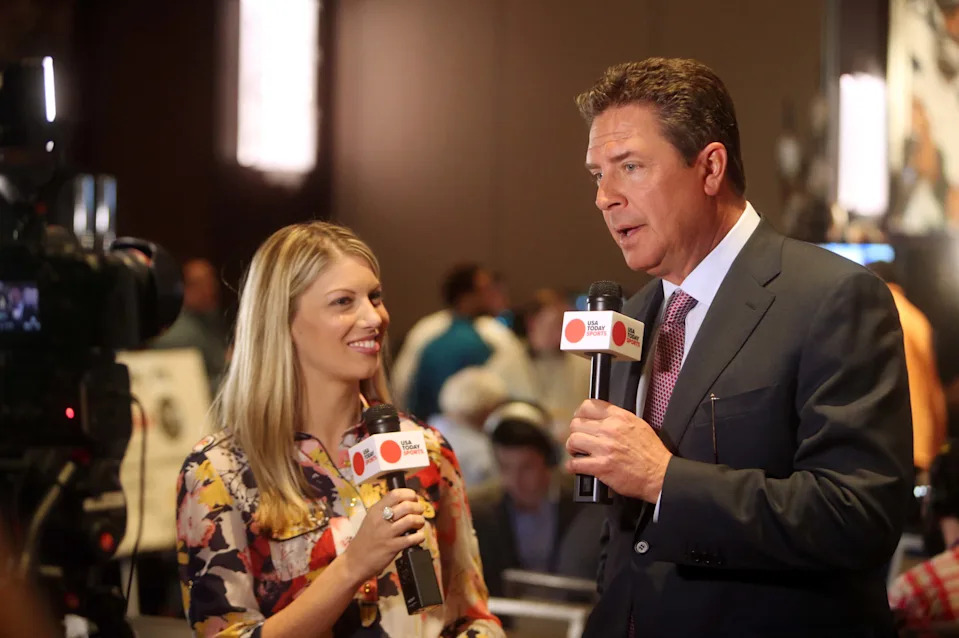Dan Marino is interviewed on radio row in preparation for Super Bowl XLVIII at the Sheraton Times Square on Jan. 29, 2014.
