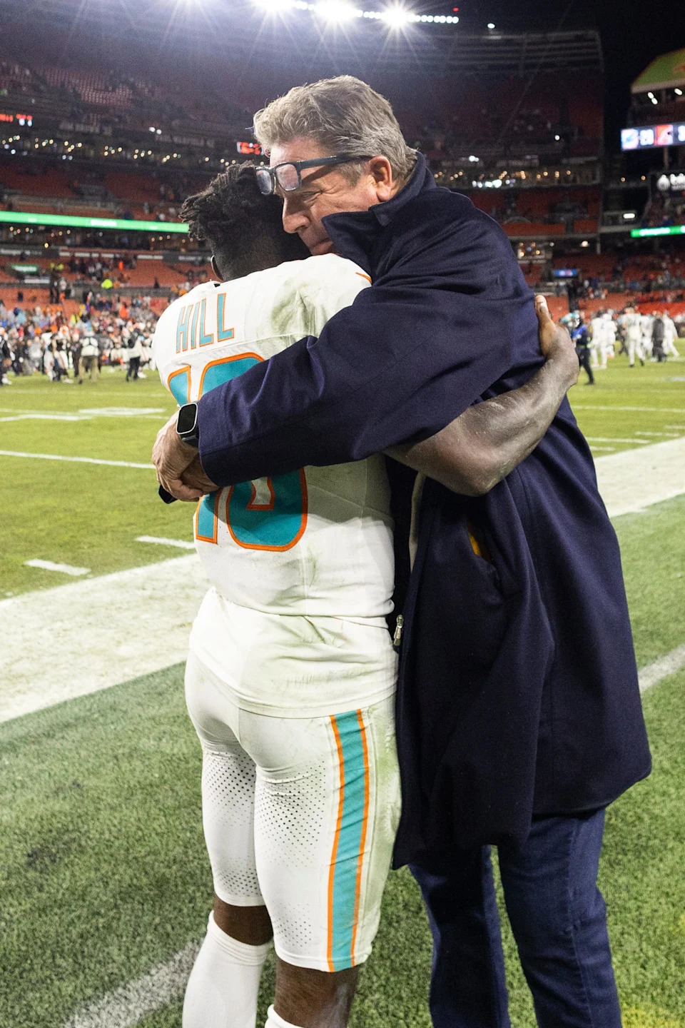 Former Miami Dolphins quarterback Dan Marino hugs wide receiver Tyreek Hill after the game against the Cleveland Browns at Huntington Bank Field on Dec. 29, 2024.