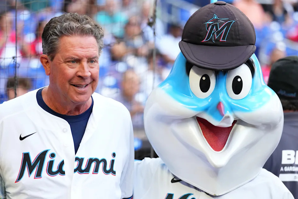 Former NFL player Dan Marino and the Miami Marlins mascot look on before a game against the Pittsburgh Pirates on MLB Opening Day at loanDepot park on March 27, 2025, in Miami.