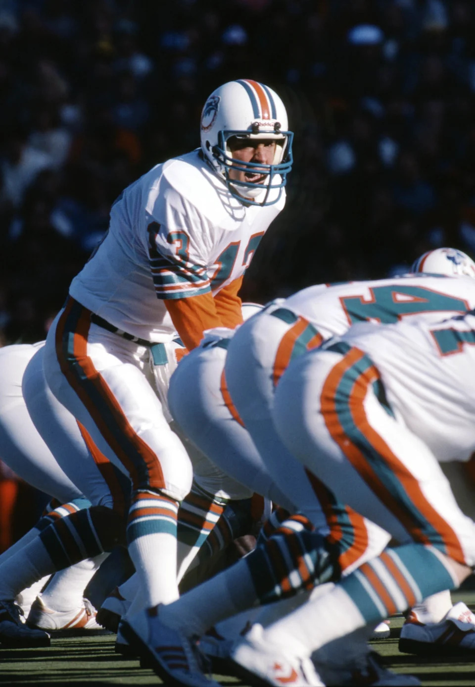 Miami Dolphins quarterbacks Dan Marino, Don Strock and coach Don Shula against the Seattle Seahawks during the 1984 AFC Divisional Playoff game at the Orange Bowl on Dec. 29, 1984.