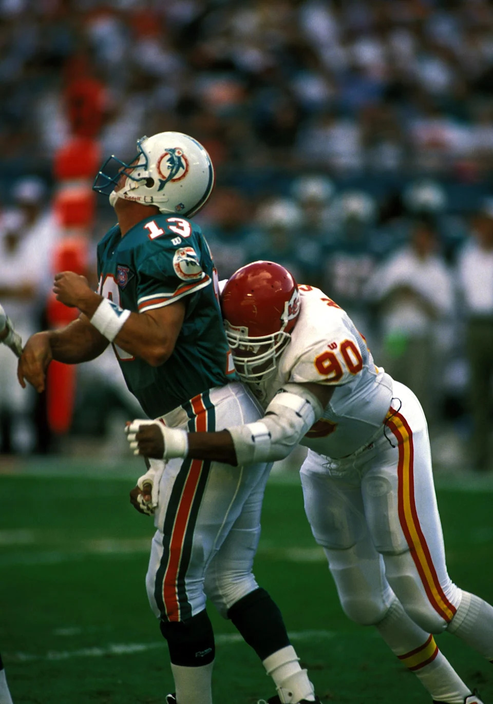 Kansas City Chiefs defensive end Neil Smith hits Miami Dolphins quarterback Dan Marino in the 1994 AFC wild-card playoff game at Joe Robbie Stadium on Dec. 31, 1994. The Dolphins defeated the Chiefs, 27-17.