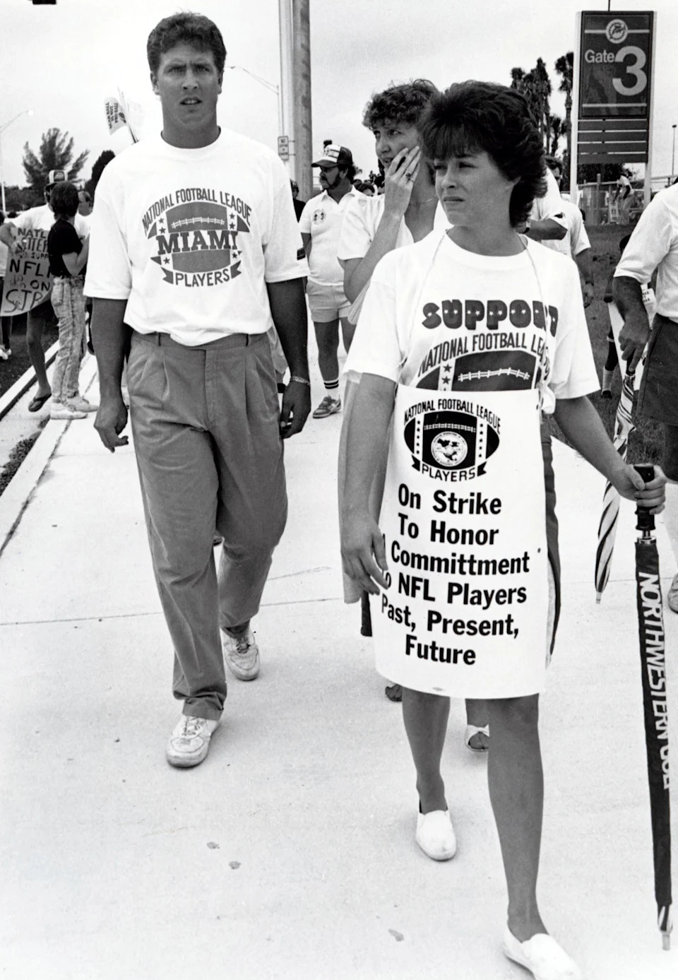 Miami Dolphins quarterback Dan Marino and Claire Marino walk the picket line outside Dolphins Stadium before the game against the Kansas City Chiefs on Oct. 11, 1987.