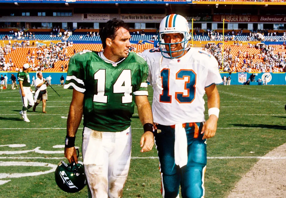 Miami Dolphins quarterback Dan Marino walks on the field with New York Jets quarterback Neil O’Donnell at Pro Player Stadium on Sept. 15, 1996.