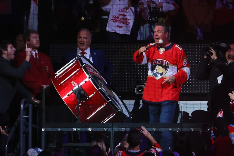 Dan Marino bangs the drum prior to the NHL game between the Florida Panthers and the Vegas Golden Knights in Game 3 of the 2023 Stanley Cup Final at FLA Live Arena on June 8, 2023, in Sunrise, Florida.