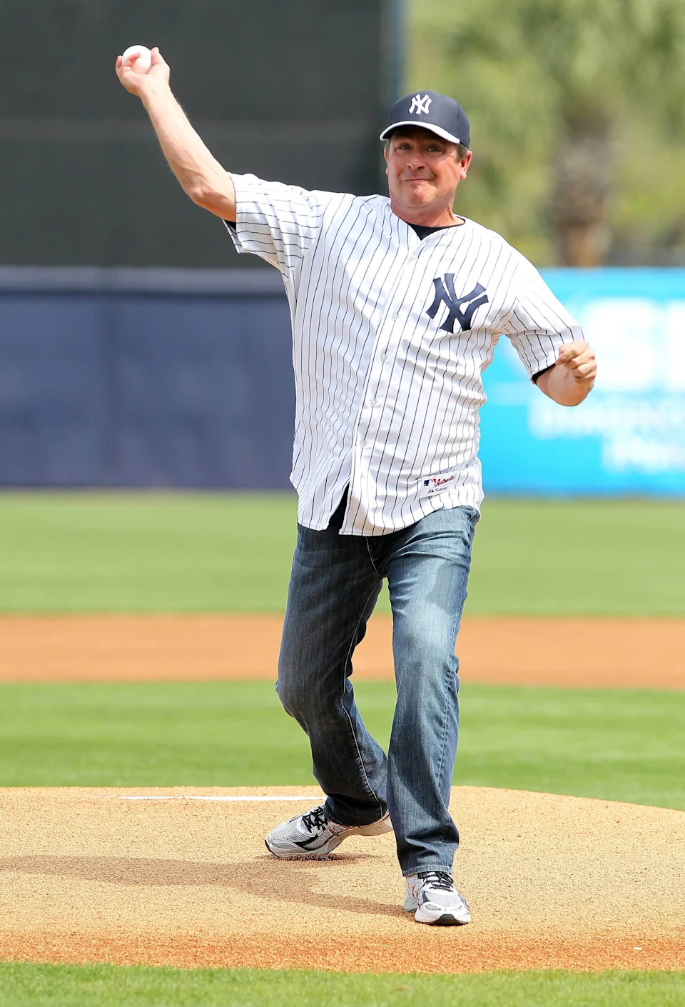 Pro Football Hall of Famer Dan Marino throws the ceremonial first pitch before the game between the Atlanta Braves and New York Yankees at George M. Steinbrenner Field in Tampa, Florida, on March 9, 2013.