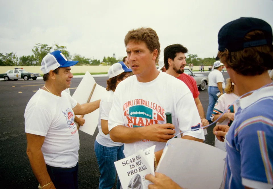 Miami Dolphins quarterback Dan Marino walks a picket line during the 1987 NFL players strike outside Joe Robbie Stadium on Oct. 11, 1987, prior to a game in which the NFL used replacement players.