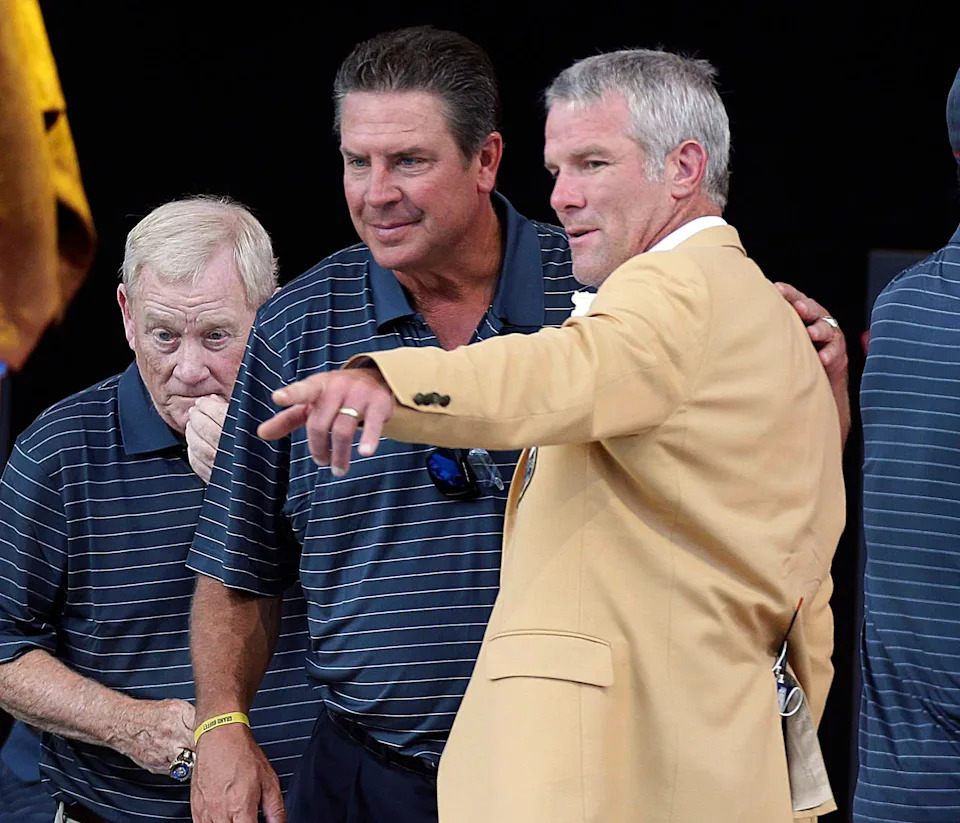 Former Green Bay Packers quarterback Brett Favre chats with former Miami Dolphins quarterback Dan Marino during the Pro Football Hall of Fame Enshrinement Ceremony at Tom Benson Stadium on Aug. 6, 2016.