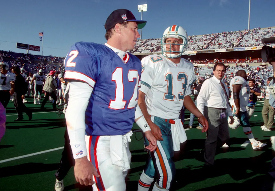Buffalo Bills quarterback Jim Kelly and Miami Dolphins quarterback Dan Marino leave the field after the Dolphins defeated the Bills 37-10 at Rich Stadium on Oct. 4, 1992.
