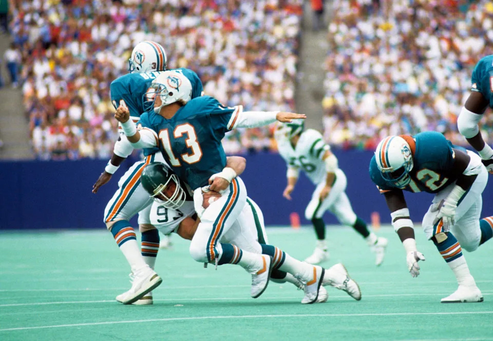 New York Jets defensive end Marty Lyons tackles Miami Dolphins quarterback Dan Marino at Giants Stadium on Sept. 21, 1986.