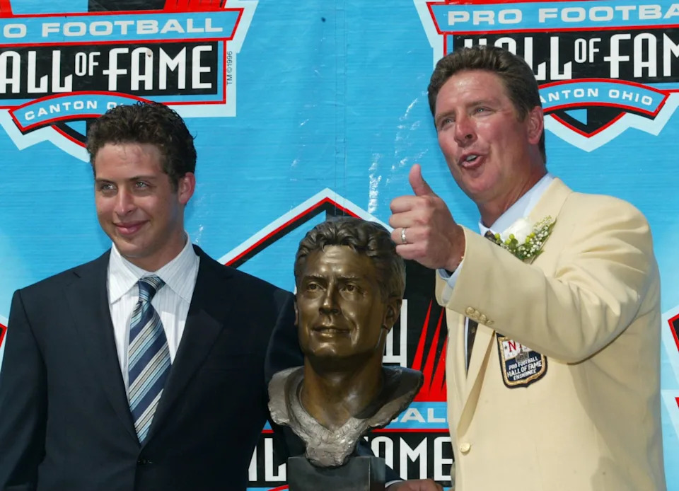Former Miami Dolphins quarterback Dan Marino and his son Dan pose with his bust after his enshrinement to the Pro Football Hall of Fame at Fawcett Stadium on Aug. 7, 2005.