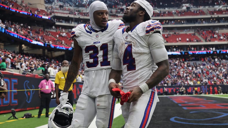 Oct 6, 2024; Houston, Texas, USA; Buffalo Bills cornerback Rasul Douglas (31) and running back James Cook (4) walk to the tunnel after losing to the Houston Texans at NRG Stadium. Mandatory Credit: Thomas Shea-Imagn Images