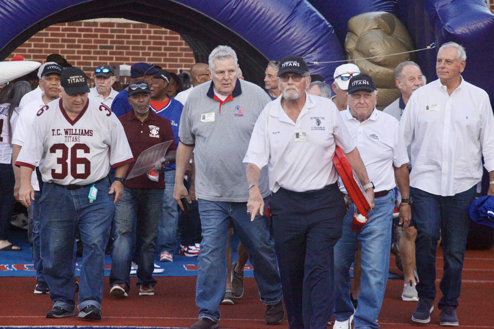 Members of the state championship-winning 1971 T.C. Williams City High School football team walk onto the field for the game commemorating the 25th anniversary celebration of the film Remember The Titans, Sept. 19, 2025 (staff photo by James Cullum)