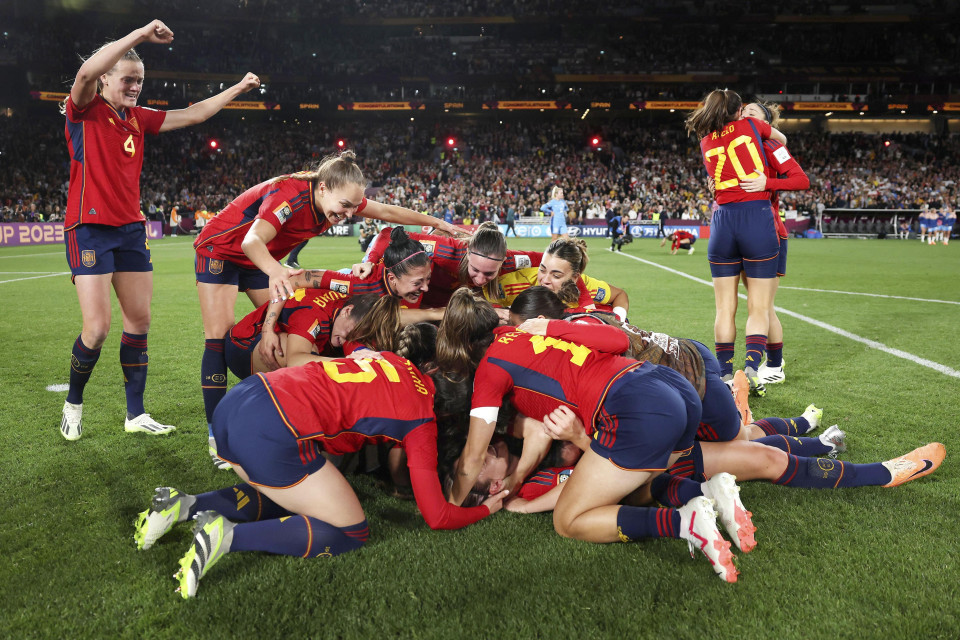 Spain players celebrate after defeating England 1-0 in the final of the FIFA Women’s World Cup on Aug. 20, 2023, in Sydney. (FIFA/Getty/Kyodo)