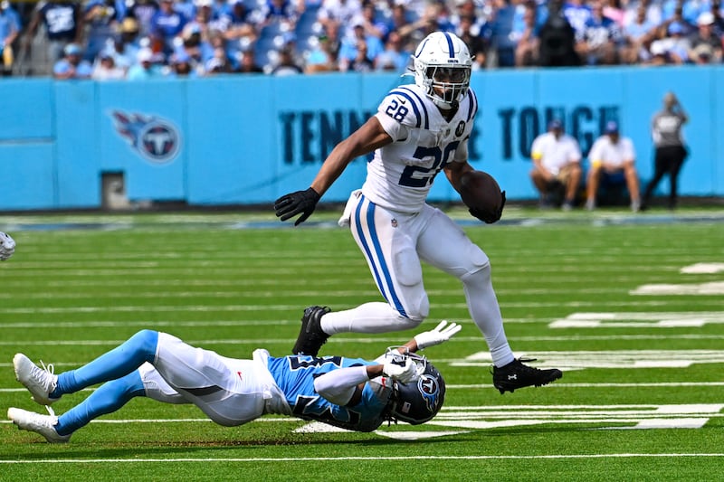Indianapolis Colts running back Jonathan Taylor (28) breaks away from Tennessee Titans cornerback L’Jarius Sneed (38) during the second half of an NFL football game Sunday, Sept. 21, 2025, in Nashville, Tenn. (AP Photo/John Amis)