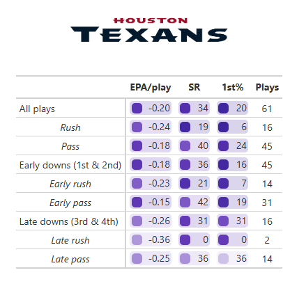 If you know nothing about EPA, success rate, or first down rate – know this, purple is bad, and green is good here. The darker the purple, the worse the performance for the Houston offense on Sunday, indicative of dominant play by the Jacksonville defense. Jacksonville was 3rd in the NFL with 10 points given up, 9th at 271 total yards surrendered, 7th at 4.7 yards per play, and 11th with 14 QB pressures for the week.