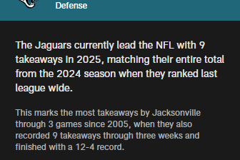 Offensively, there’s much to still be figured out between the Brian Thomas Jr situation, how much may Travis Hunter be used offensively as the year goes on (and the deep passing game struggles continue), and how will they counter more teams continuing to stack the box moving forward. Jacksonville retained the win, but those questions will all require quick answers with San Fransico coming up. This was the same team who, in 2023 made the “Trevor Lawrence only throws to his first read” narrative a thing by sitting on all routes under 10-yards, stacking the box, and forcing the team to beat them early in the passing game. I expect them to follow suit in week 4 and also expect Coen and Udinski to have better answers for the 49ers than Doug Pederson’s offense did. Time will tell!