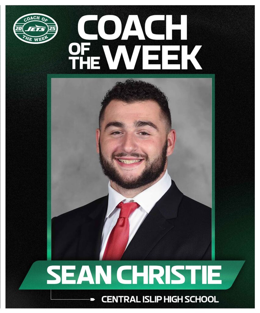 Central Islip head football coach Sean Christie has been named this week’s New York Jets High School Coach of the Week.