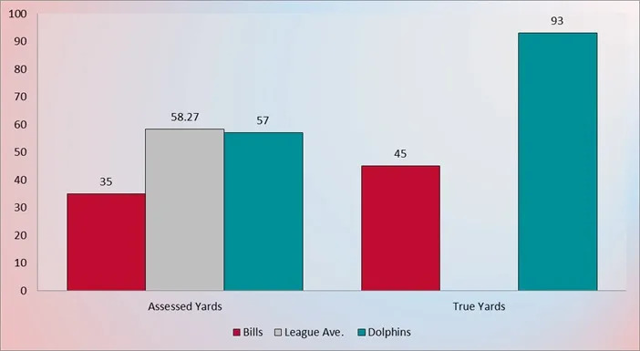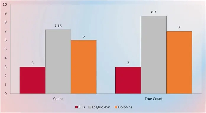 The Dolphins come in just under the mean for both sides of the chart. However, to illustrate how clean the day was for Buffalo, it’s pretty wild how much lower their bars are. Also, check out the league average for count. That might be a good omen. Or just a coincidence. I’ll let you be the judge.
