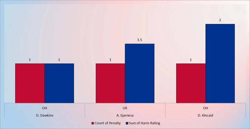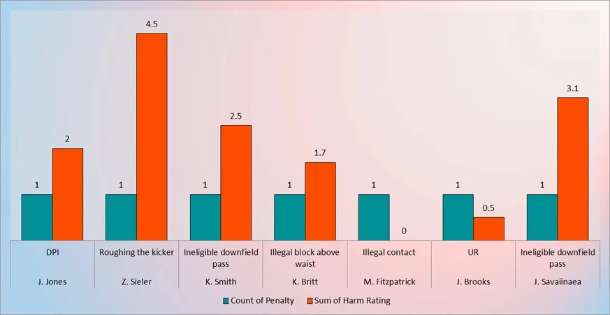 Buffalo’s total Harm for the day was 4.5, which falls below our “bad day” threshold of 10.0 Harm by a significant margin. Put plainly, the Bills were not remotely hindered by flags.