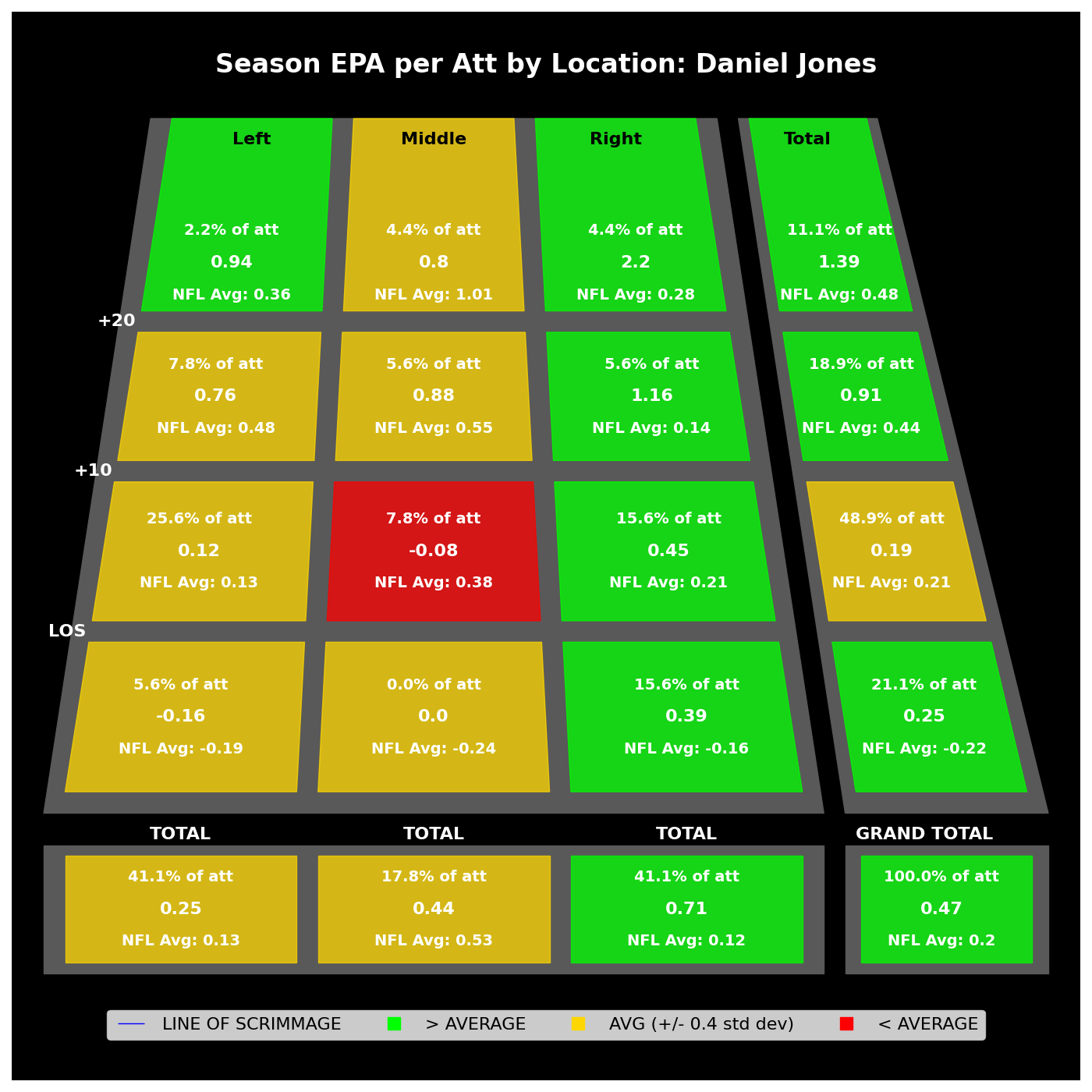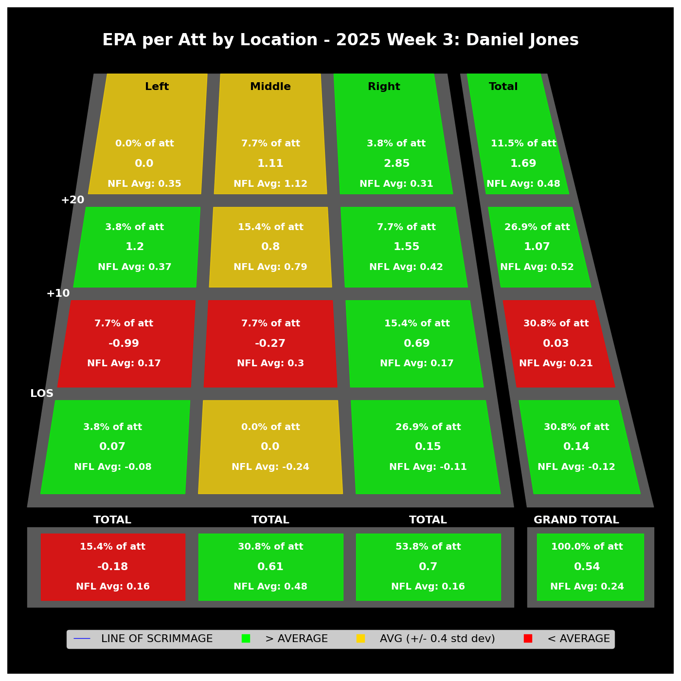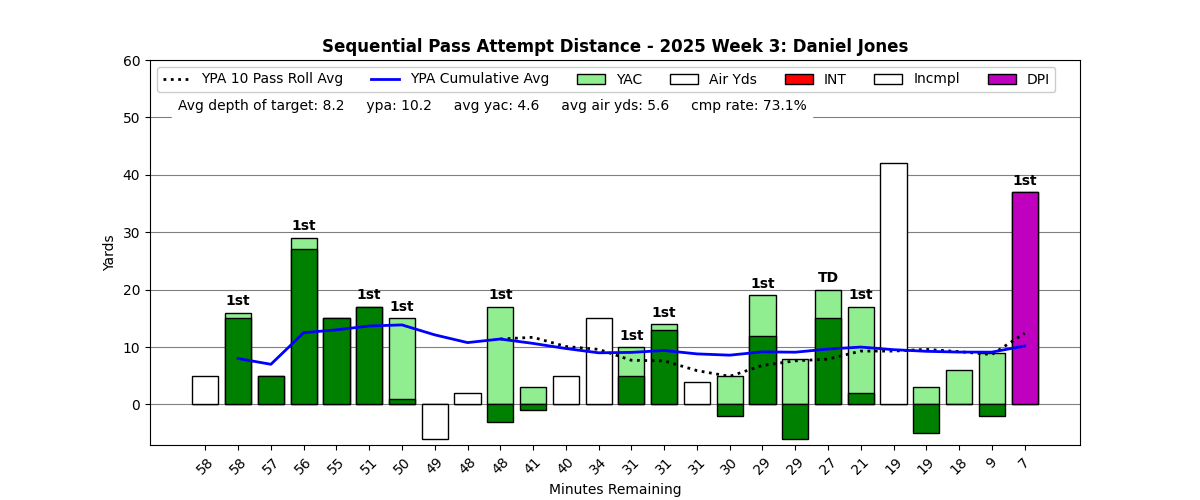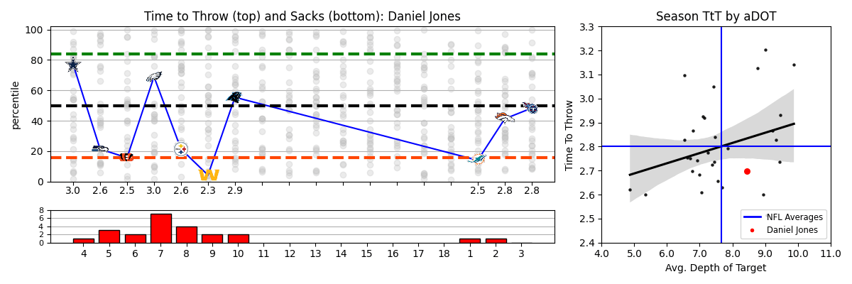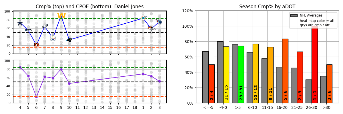 For the trailing week comparison, I switched the view to only Daniel Jones rather than the Colts, so you can see how his first 3 games in an Indy uniform stack up against where he was on the Giants. As you can see, its night and day.