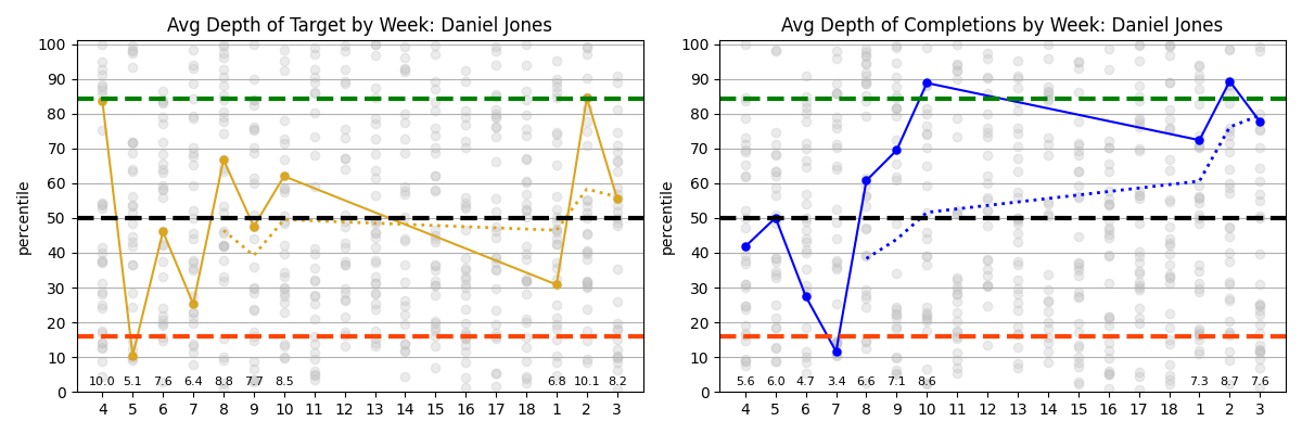 His time to throw ticked up this week while his passing depth dropped a bit — usually the opposite of what you want to see. But with good protection and minimal pressure, it’s not a major concern… at least for now.