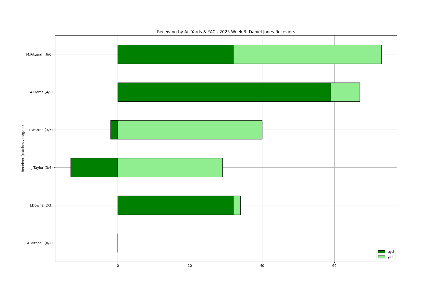 In Week 3, the Colts leaned on the passing game even though Jonathan Taylor was highly efficient all day (2nd edp, 2nd arsr).Jones was not pressured much at all and considering he stayed in the pocket longer than most QBs, that points to great O-line protection (30th pr%, 9th tip).Good passing depth + good YAC + good completion rate = great yards per attempt (5th ay/c, 6th yac, 11th ac%, 5th aypa)Jones didn’t take a sack or throw the ball away, instead choosing to scramble to escape the minimal pressure he faced (29th sck%, 28th ta%, 9th scr%). That led to the 6th lowest abandoned attempt rate and that makes me very happy (27th aa%). I want my QBs attempting passes, not opting out of them.The net result of all of that was strong yardage per play, which consistently translated into first downs (3rd ny/p, 3rd 1st%).He only had 1 passing TD, but again did not turn the ball over (14th td%, 27th to%). One of the key drivers of Jones’ impressive 2022 season was his extremely low turnover rate.