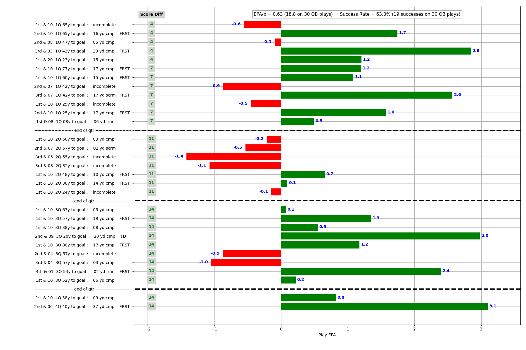 In Week 3, the Colts leaned on the passing game even though Jonathan Taylor was highly efficient all day (2nd edp, 2nd arsr).Jones was not pressured much at all and considering he stayed in the pocket longer than most QBs, that points to great O-line protection (30th pr%, 9th tip).Good passing depth + good YAC + good completion rate = great yards per attempt (5th ay/c, 6th yac, 11th ac%, 5th aypa)Jones didn’t take a sack or throw the ball away, instead choosing to scramble to escape the minimal pressure he faced (29th sck%, 28th ta%, 9th scr%). That led to the 6th lowest abandoned attempt rate and that makes me very happy (27th aa%). I want my QBs attempting passes, not opting out of them.The net result of all of that was strong yardage per play, which consistently translated into first downs (3rd ny/p, 3rd 1st%).He only had 1 passing TD, but again did not turn the ball over (14th td%, 27th to%). One of the key drivers of Jones’ impressive 2022 season was his extremely low turnover rate.