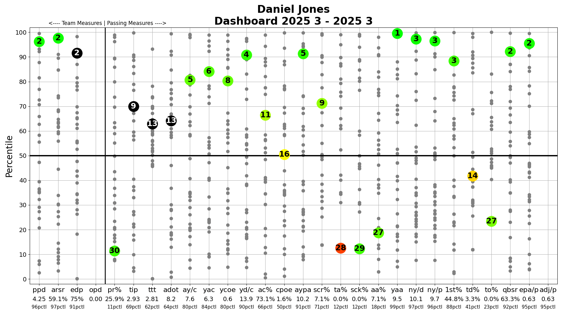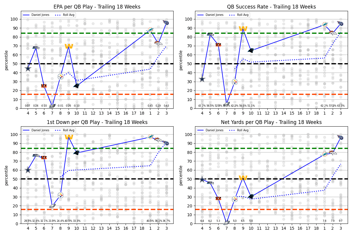 For the trailing week comparison, I switched the view to only Daniel Jones rather than the Colts, so you can see how his first 3 games in an Indy uniform stack up against where he was on the Giants. As you can see, its night and day.